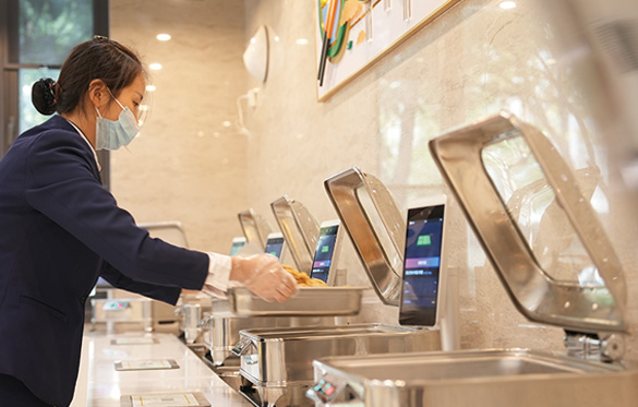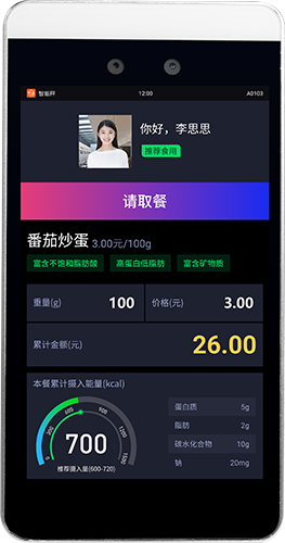 该款自助称重台集成人脸识别、称重感应及射频识别技术,可自动识别就餐者身份并精准计量。选餐时,显示屏同步展示菜品营养信息与实时价格,实现餐前提醒。用餐结束后,系统自动生成个性化营养报告及膳食建议,助力就餐者掌握膳食情况,促进营养均衡与健康饮食。