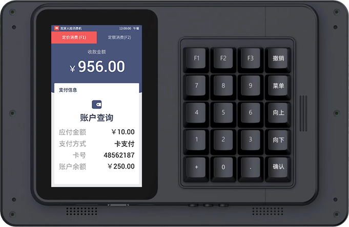 该款人脸双面屏挂式收银机,支持定价收银、定额收银、账户消费情况查询以及营业汇总等操作,可刷卡、扫码、人脸支付。采用挂式设计,无需占用台面空间,尤其适合食堂档口、小型商铺等空间紧凑的场景。