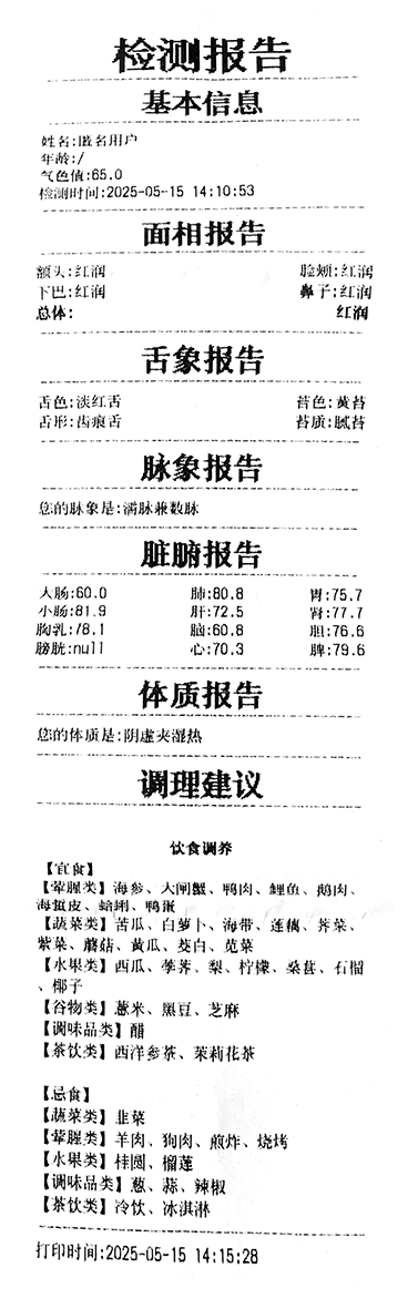 AI中医快检仪融合智能大数据分析和AI技术,基于数十万份临床病理报告数据构建诊断模型,可对人员进行面色、脉搏、舌苔等全方位辨识。通过智能分析,生成12脏腑的精准健康数值,并提供针对性的饮食、健康、穴位等调理方案。
