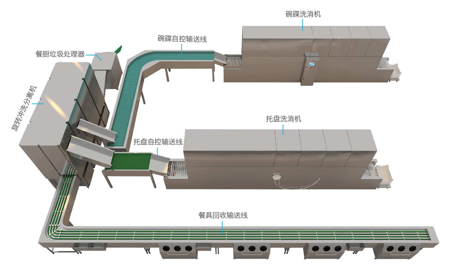智盘全自动收餐洗消系统,专为学校食堂、机关食堂及企事业单位餐厅等高人流量场所量身打造,集餐盘自动回收、智能碗盘分离、高效清洗烘干、环保垃圾处理及自动化碗盘收集于一体,操作简便、高度自动化,不仅大幅节省人工,提升效率,还通过节能技术和水循环利用实现资源高效利用,同时严格遵守食品安全标准,确保餐具卫生安全,营造绿色、健康的餐饮环境。