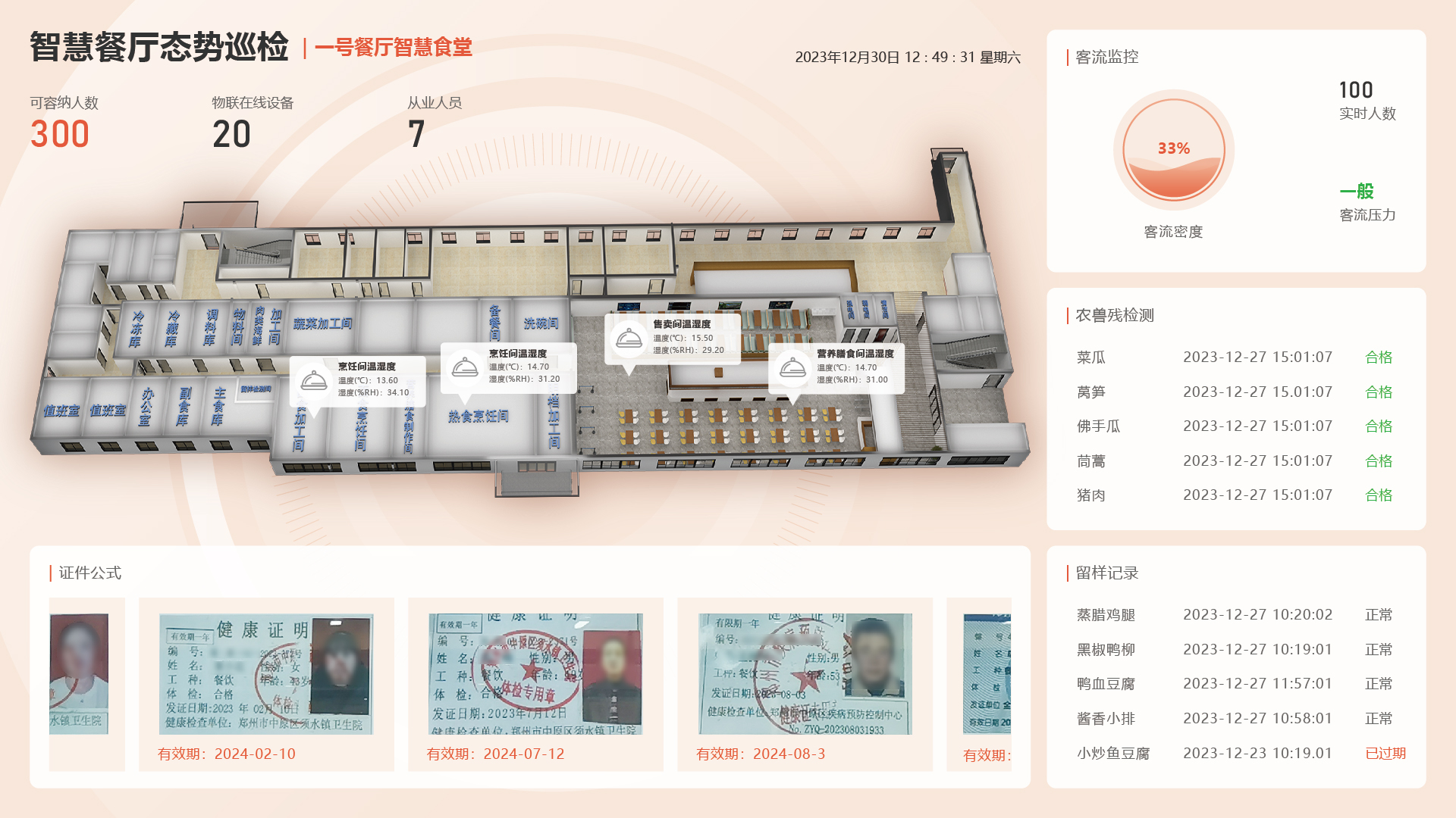 ● 空气质量与客流监测:实时更新食堂空气质量与客流情况,优化就餐环境安排。